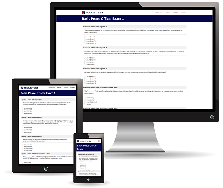 TCOLE Test provides a selection of practice tests covering a variety of subjects to assist with your studies for one of the several certification exams required by the Texas Commission on Law Enforcement. Certifications covered within include Basic Corrections Officer, Basic Peace Officer, Law Enforcement Promotional Exam, and the newly added Court Security Specialist.